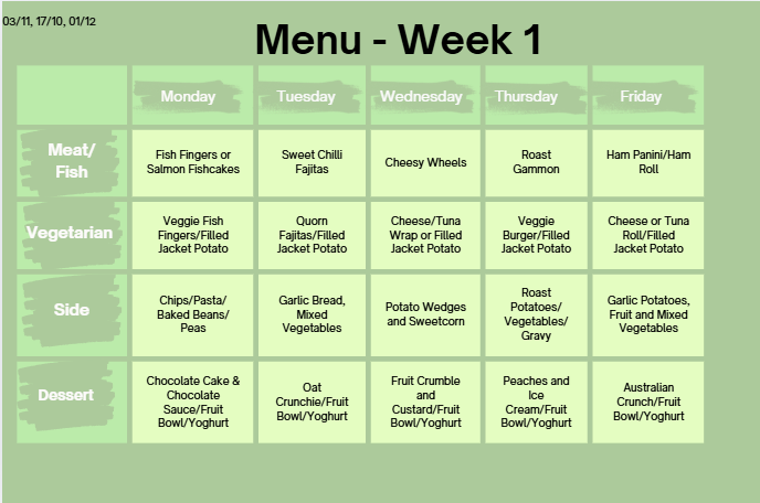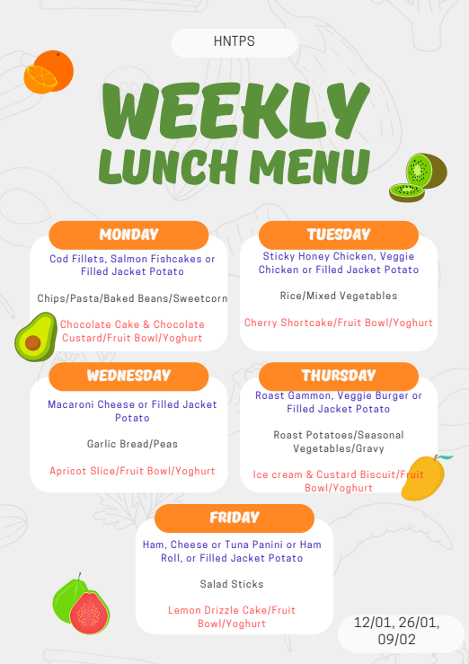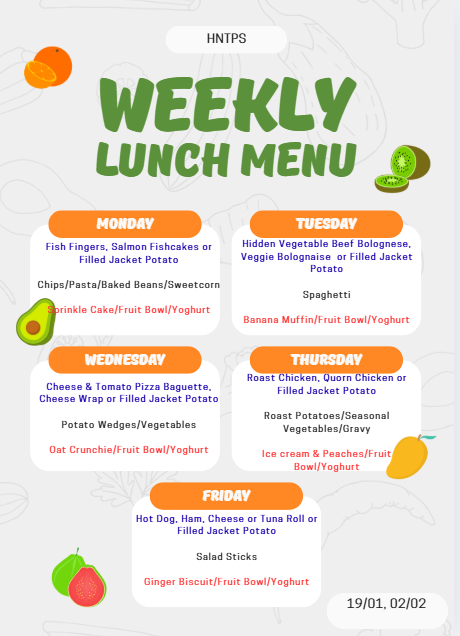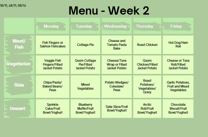 Our school dinner menu is sent home on a four weekly basis and is updated here on our website.