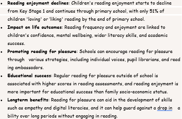 Research indicates that reading for pleasure is crucial for children's development and success. Here are some key findings:
