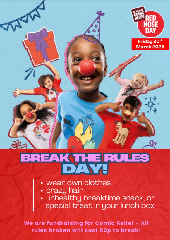Next Friday 20th March, children at HNTPS are invited to ‘break the Rules’ doing something funny to raise money for Comic Relief. The children can come dressed in their own clothes or wear something funny, come to school with crazy hair, have a special treat snack for breaktime or something extra special in their lunch box for the day. We are asking for a 50p donation for each rule that is broken, please use the following link to donate funds to Comic Relief: